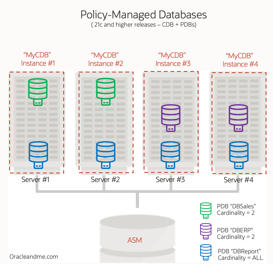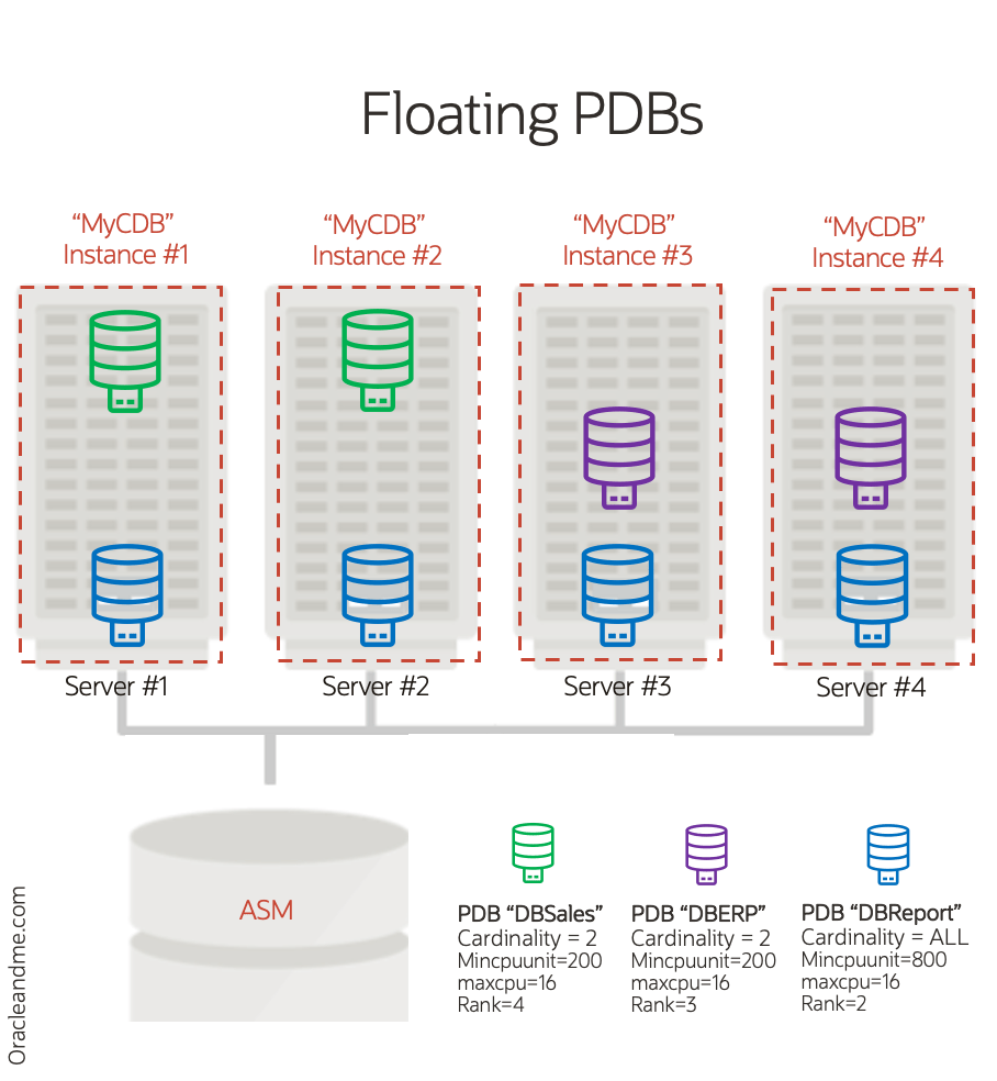 - The new “Policy-managed deployment” (aka “Floating PDBs”): Don’t be confused by the name. It has nothing to do with traditional server pools. This is the new configuration that allows us to define the cardinality, min/max CPU, and rank for each PDB. The name “policy-managed databases” has been kept because, in fact, with the new canonical Oracle architecture, PDBs are “the” databases.