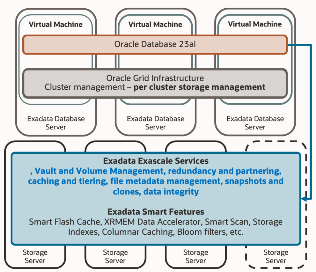 The first change introduced by Exascale architecture is that Exascale software has moved to Exadata’s storage cells. Those of you with experience in Exadata probably know this software from interacting with it locally in the cells through the “cellcli” binary. We use this binary to fetch specific metrics, define IORM plans, set certain behavioural parameters, and other tasks. It is this Exadata software that performs all the magic behind the scenes, moving hot objects between different storage tiers (hard disk, flash cache, RAM), maintaining in-cell indexes, ensuring IO quality of service for each entity, and much more.