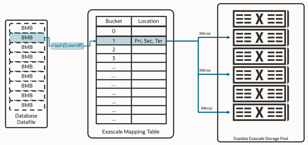 But that diagram, that architecture, would not be enough to overcome the limitations we previously discussed about ASM. Exascale introduces a crucial intermediary component between the extents and the physical data locations called the “Exascale Mapping Table.” This table contains two columns: a column for buckets and a column for physical locations. The extents now relate to the buckets, but it’s not necessarily a 1-1 relationship. It’s possible that two extents from two different databases point to the same bucket; this will occur if we perform a “thin clone” (aka. snapshot clone, snapshot copy). Then, that bucket will contain the physical location of the content of that bucket (of that extent or those extents). But not just one physical location, rather the location of all copies of that extent. This means we have the capability to define data redundancy at the extent level.