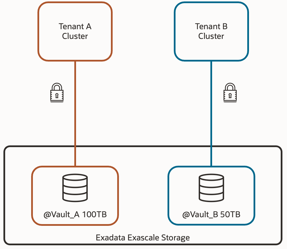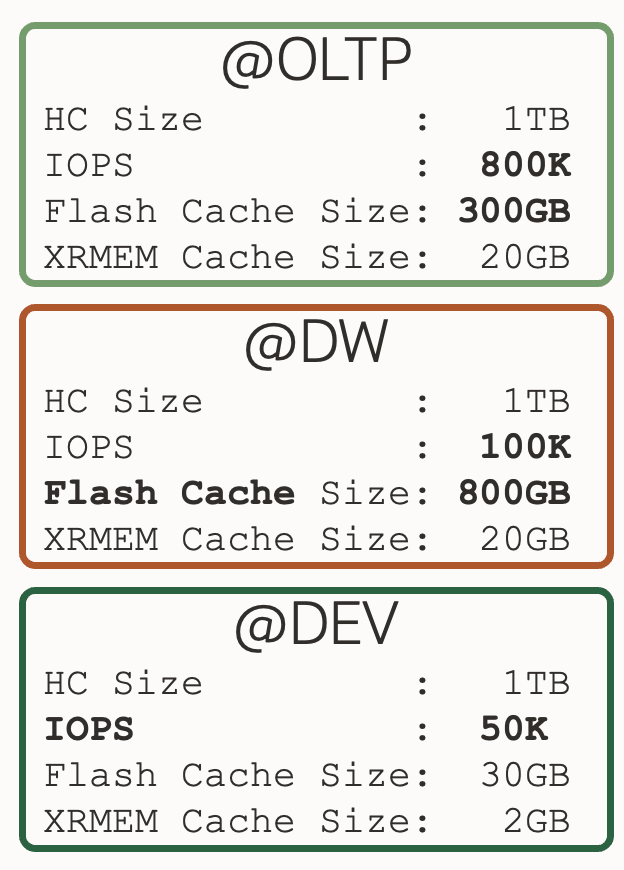 These structures are called Vaults, and they are what really come to replace the diskgroups from the database perspective. That is, within the database, instead of using +DATA, we’ll use @vault_prod1 – for example. We’ll be able to define a maximum storage space for each pool, so that certain databases don’t consume space that others might need. Additionally, we can associate IORM policies for each of the vaults, including maximum IOPS, usable flash cache size, usable XRMEM size, and usable Flash Log space.
